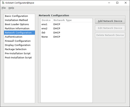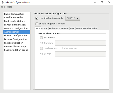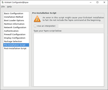 - PXE 서버의 GUI 환경에서 system-config-kickstart를 실행해서 /nfs/ks-centos79A.cfg를 불러들인다. 이후에 적당한 설정을 바꾼다.