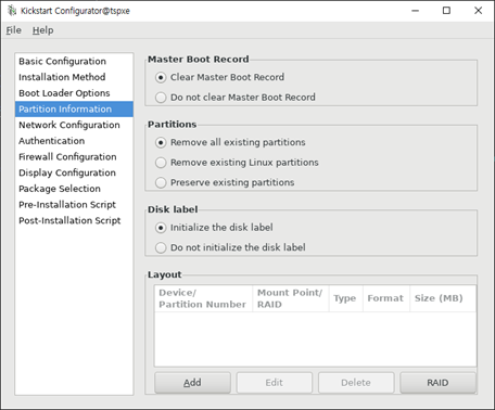 - Partition Information: 파티션 설정에 대한 부분이다. Layout 부분에 원하는 파티션 구성을 넣으면 되는데, 자세한 것은 아래에 있는 Kickstart Syntax Reference를 참고해서 kickstart 파일에 수동으로 입력하는 것도 좋다.