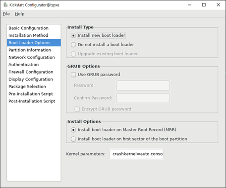 - PXE 부트 메뉴에 inst.ks=라는 옵션을 추가하면 된다. 이런 식으로 필요한 설치 옵션을 계속 추가할 수 있다.