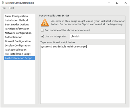 - Post-Installation Script: OS를 설치를 마치고, 미리 뭔가 시스템에 설정해야 하는 게 있으면 여기에 적어두면 편하다. 예제에선 GUI로 부팅하는 것을 Text로 부팅하게 하는 명령어를 넣어 놨는데, 설치 후에 반복적으로 설정해야 하는 것이 있다면 여기에 넣어두면 설치 후 작업을 줄일 수 있다.