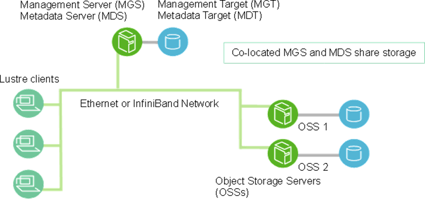 - 다른 병렬 파일 시스템들과 같이 management, metadata 및 storage로 3가지 용도의 서버가 존재한다. 각각 MGS, MDS, OSS라 칭한다.