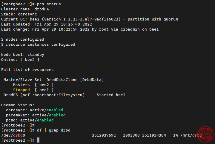 테스트를 위해 현재 master로 활성화된 노드를 standby 상태로 바꾸면, 두번째 노드로 master 역할이 넘어가면서 DRBD 파티션이 마운트되는 것을 확인할 수 있다.