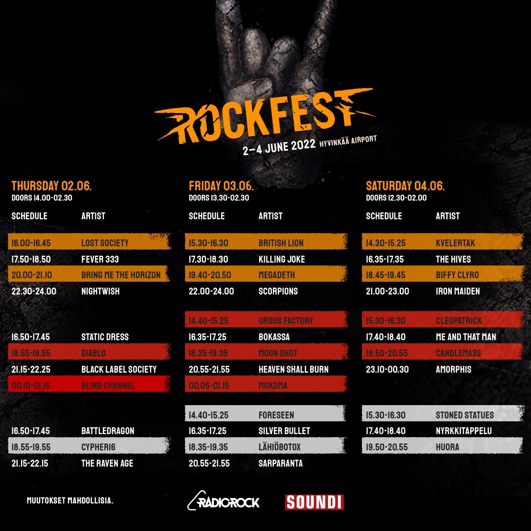외국에서 락페를 본 적도 없거니와, 여름에 낮이 엄청 긴 북유럽에서의 야외 락페는 시간이 궁금했는데 시간표가 나왔습니다.