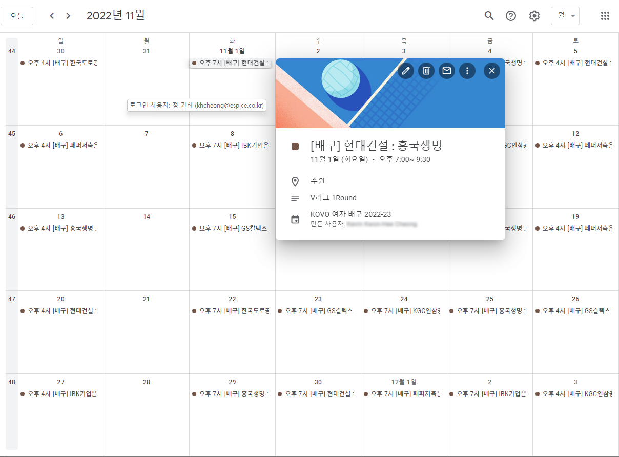22-23 시즌 여자 배구 일정이 KOVO 홈페이지에 나와서 그 정보를 긁어서 약간 손봐서 구글 캘린더에 넣었습니다.