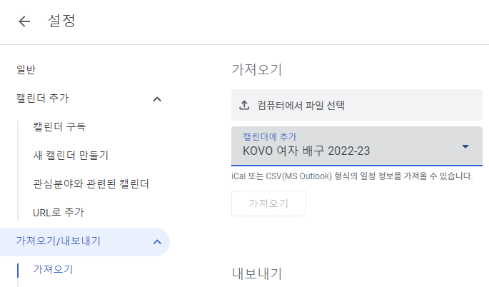 2. "가져오기/내보내기"에서 추가할 구글 캘린더를 선택하고 "컴퓨터에서 파일 선택"을 한 후에 첨부된 파일을 불러들이면 끝입니다.