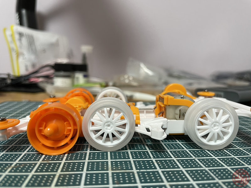 앞바퀴 조향 부품 설치하고, 뒷바퀴 축도 길게 만든 후 한 컷.