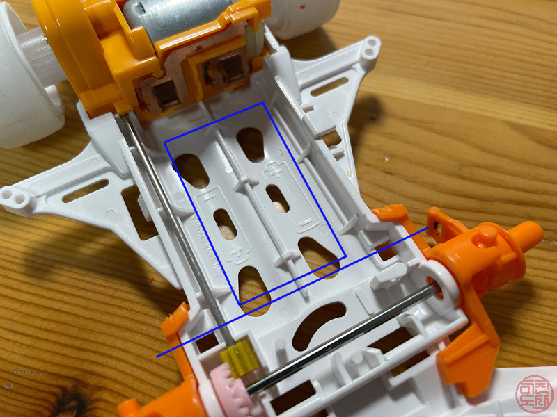 좌우 바퀴 링크를 위한 부품은 차체를 통과하게 하고, AA배터리 2개 들어가는 공간에는 얇은 Li-Po 배터리를 넣으려 한다.