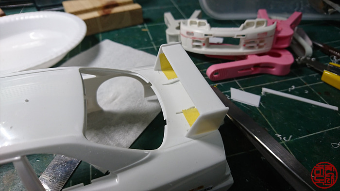 차량의 뒤에 달린 윙은 원래 키트와 모양이 많이 달라서, 플라판을 잘라서 자작해주었습니다.