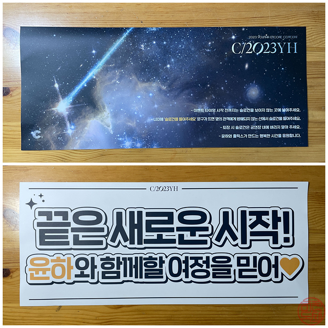 - 입장할 때 응원 슬로건을 하나씩 가져가라고 했는데, 안 챙겼다. 들고 있으면 공연 보기에 불편할 것 같아서. 이게 이틀동안 문구가 달랐었나 보다. 공연 끝나고 기념으로 하나 챙겼다. ㅎㅎ